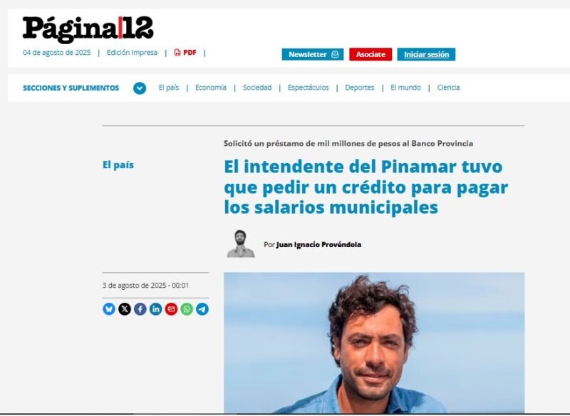 Según publicó el diario nacional Página/12, el municipio de Pinamar gestionó un crédito ante la Provincia de Buenos Aires para hacer frente al pago de los sueldos municipales correspondientes a julio. La solicitud se tramitó a través del Ministerio de Economía bonaerense y fue autorizada como parte de los mecanismos de asistencia financiera que ofrece el Estado provincial a los municipios en situaciones fiscales delicadas.