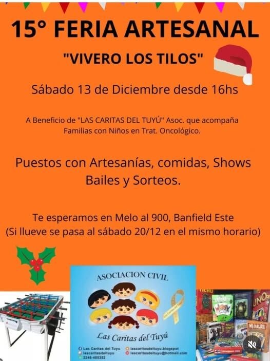 Este sábado 13 de diciembre desde las 16 horas se llevará a cabo la 15° Feria Artesanal “Vivero Los Tilos” en Melo al 900, Banfield Este. El evento contará con puestos de artesanías, comidas, shows, bailes y sorteos. En caso de mal tiempo, se reprogramará para el sábado 20 en el mismo horario.