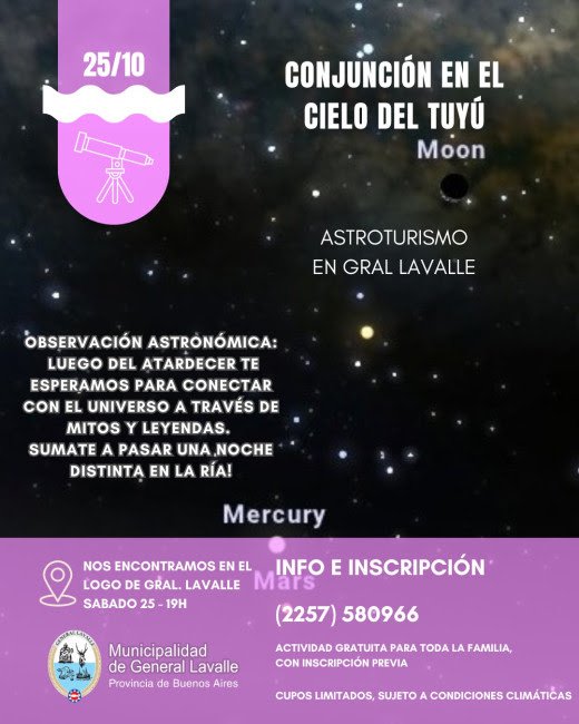 La Dirección de Turismo de la Municipalidad de General Lavalle invitó a toda la familia a disfrutar de una nueva experiencia de Astroturismo con la actividad “Conjunción en el cielo”.