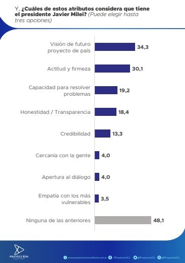Según los datos, el 51,9% de los encuestados le reconoce al menos un atributo positivo a Milei. Los más mencionados son su visión de futuro (34,3%), su actitud y firmeza (30,1%) y su capacidad para resolver problemas (19,2%).